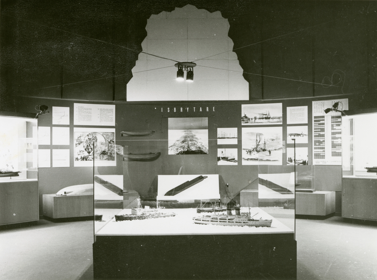 Utställningen "Isbrytare". Utställningsinteriör, mittsektionen med modell samt fotografier.