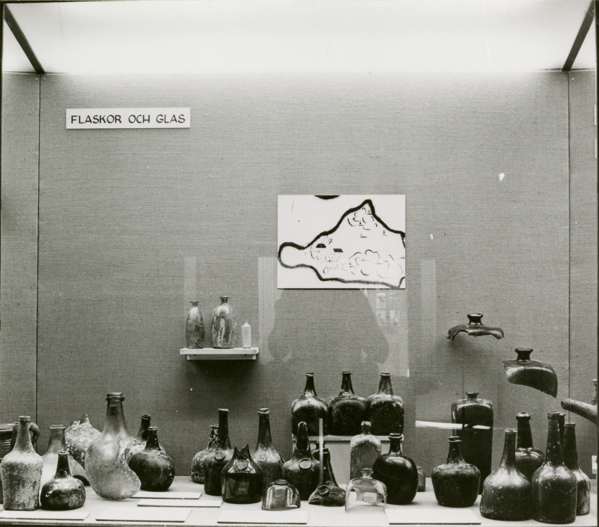 Utställningen "Djurhamn Historisk ankagrund". Monter med lösfynd bestående av flaskor.