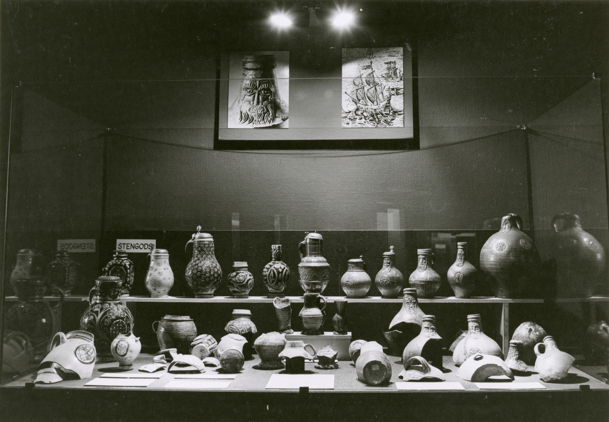 Utställningen "Djurhamn Historisk ankargrund". Monter med lösfynd bestående av stengodsföremål.