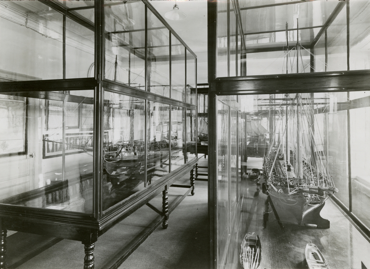 Marinmuseum på Strandvägen 58 åren 19261935. Utställning i örlogsavdelningen. Större segelfartygsmodeller, linjeskeppsmodeller, i skärgårdsflottans rum.