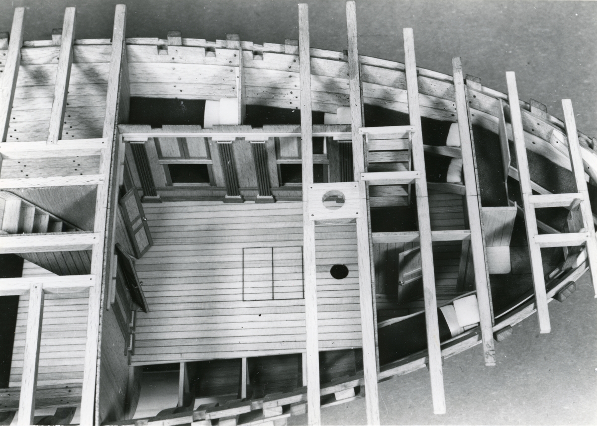 Modell av hjulångaren NORRLAND under byggnad i Sjöhistoriska museets modellverkstad. Interiör, förskepp med kabysser.