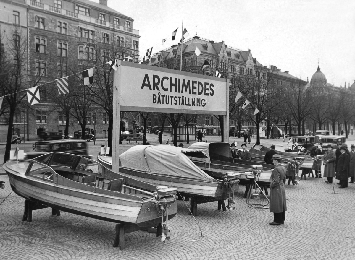 "Archimedes båtutställning". Campingbåtar utställda på Strandvägen, Stockholm.