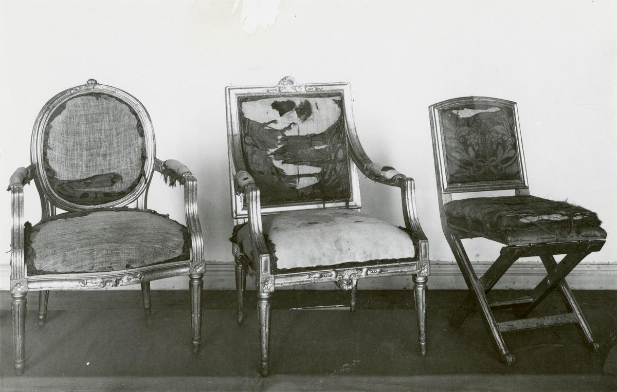 Utställning av AMPHIONs inredning. Möbler som tillhört kajutan 1778. Före restaureringen 1937.