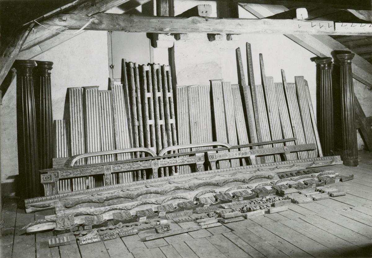 Utställning av AMPHIONs inredning. Bevarade listverk och pelare från kajutans inredning.