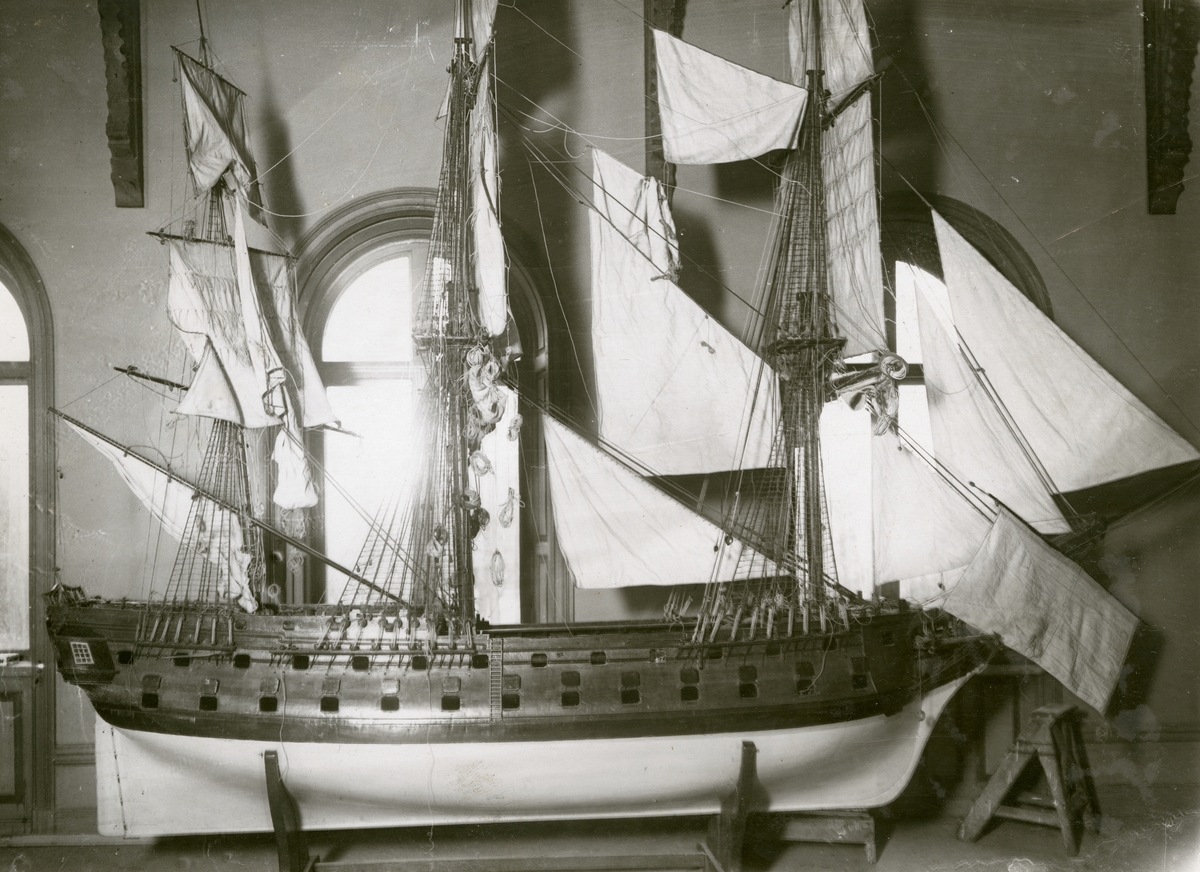Utställning i Marin- och Sjöfartsmuseer, in- och utland. Modell av 60 kanoners linjeskepp av KRONPRINS GUSTAF ADOLF-klass.