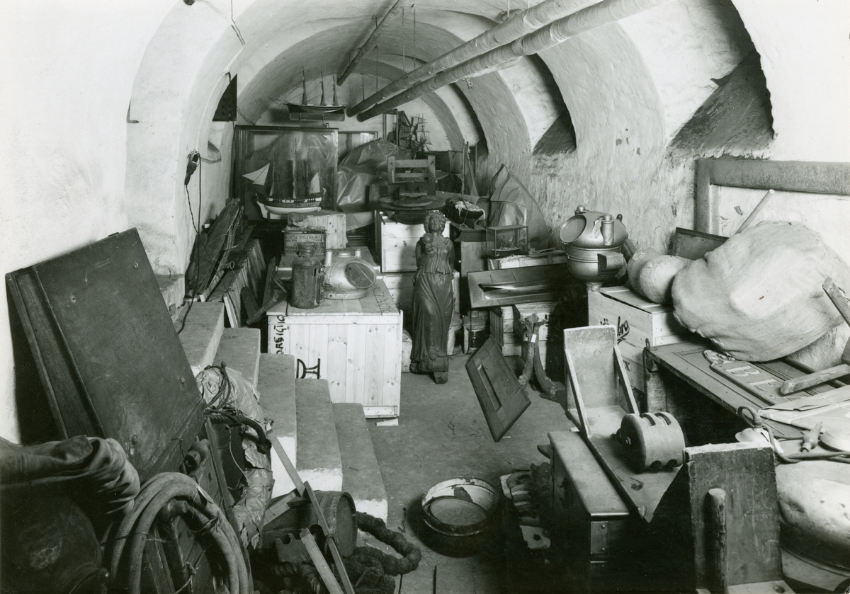 Koppling till utställning i Sjöfartsmuseum. Interiör av magasinerade föremål i källaren i gamla riksbankshuset, Sjöfartsmuseet, Skeppsbron 36 i Gamla Stan, Stockholm.
