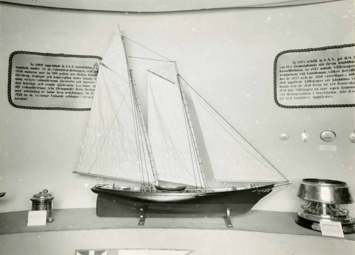 Utställningen "Svea Rike" på Stockholmsutställningen 1930. Presentation av S.S.S. (Kungliga Svenska Segelsällskapet). Fartygsmodell, pokaler m.m. i samband med Kungliga Svenska Segelsällskapets 100 år jubileum.