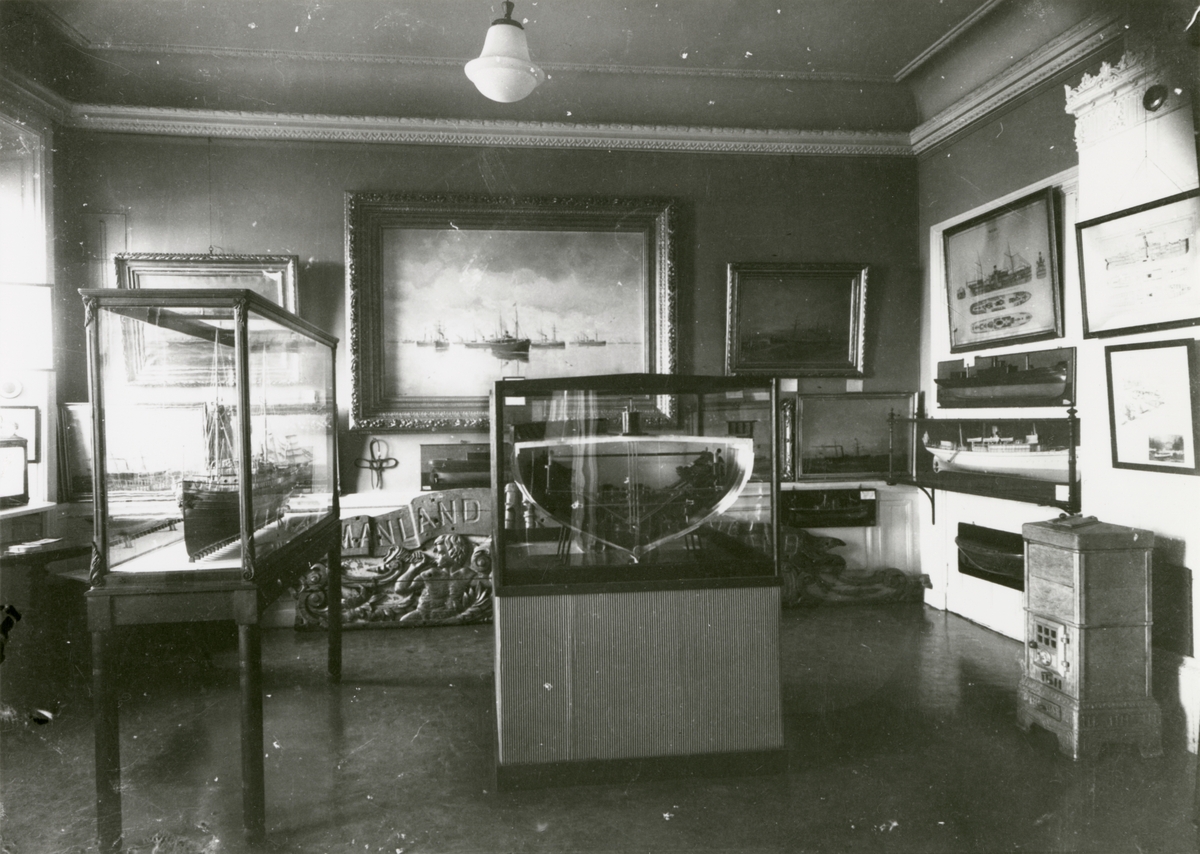 Utställning i Segelfartygsavdelningen på Sjöfartsmuseet, Skeppsbron 46, Stockholm. Överblicksbild med fartygsmodeller i glasmontrar.