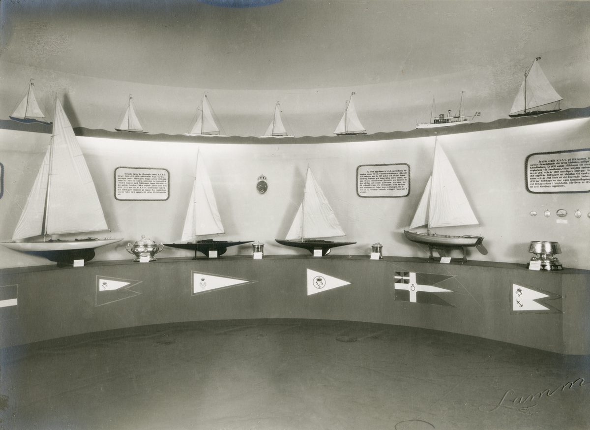Utställningen "Svea Rike" på Stockholmsutställningen 1930. Presentation av S.S.S. (Kungliga Svenska Segelsällskapet). Fartygsmodeller, pokaler m.m. i samband med Kungliga Svenska Segelsällskapets 100 år jubileum.