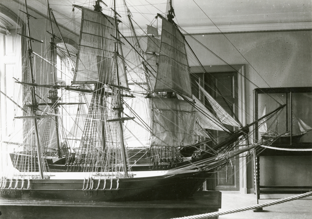 Utställning i Sjöfartsmusum, Skeppsbron 46, Stockholm. Interiörbild med fartygsmodell.