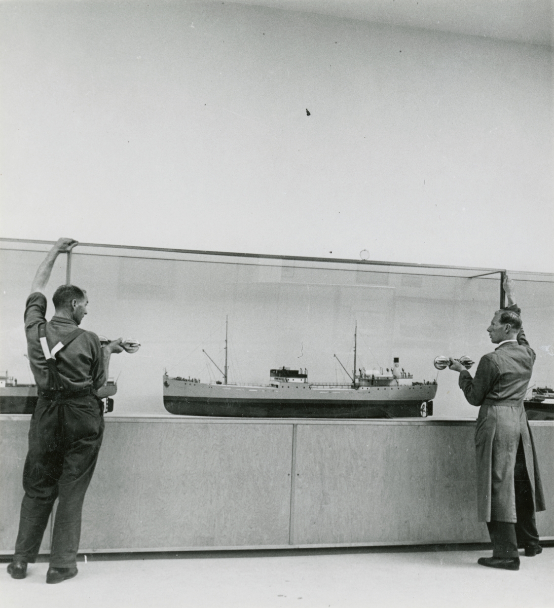 Uppordnade av utställning i Sjöfartsavdelningen i det nybyggda Sjöhistoriska museet 1937. Personal hanterar monterglas med glashandtag.