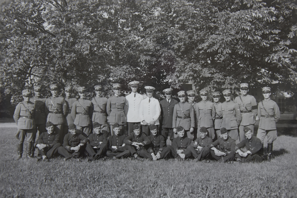 Gruppfotografi av elever och lärare på arméspaningskursen år 1934. 27 män på ett fält.