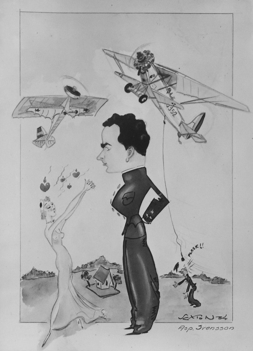 Karikatyrbild av militäre flygaren, aspirant Svensson, ur flygvapnet, 1934,
