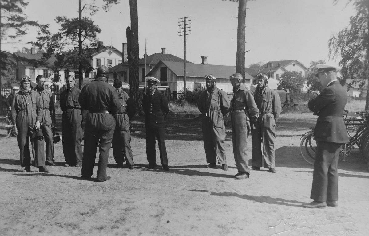 Ordergivning för militära flygelever, omkring 1935. Samling på grusplan med byggnader i bakgrunden. Med Nils Olof Svensson (senare Sefeldt) och chefen för Östgöta flygflottilj, Gösta von Porat (till höger).
