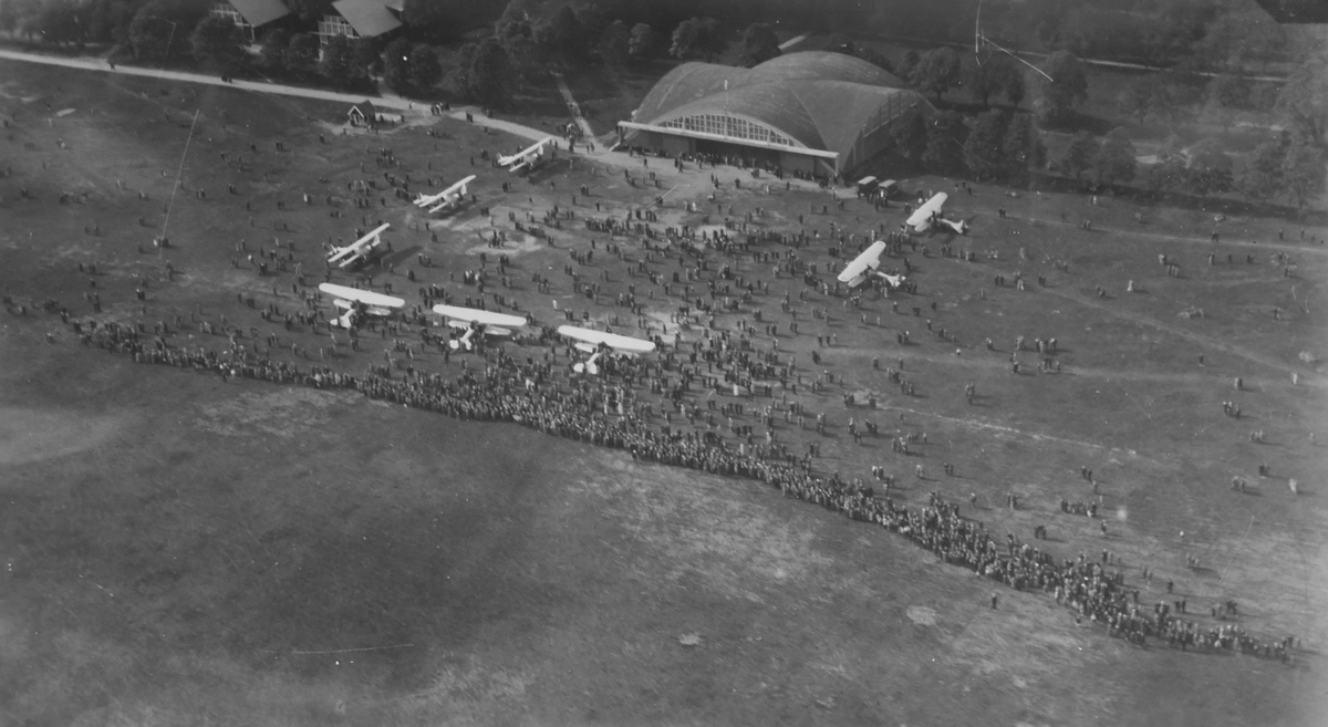 Flygbild av flygfält och hangar 81 vid flygdag på F 3 Malmen, 1934. Folksamling och flygplan på fältet.