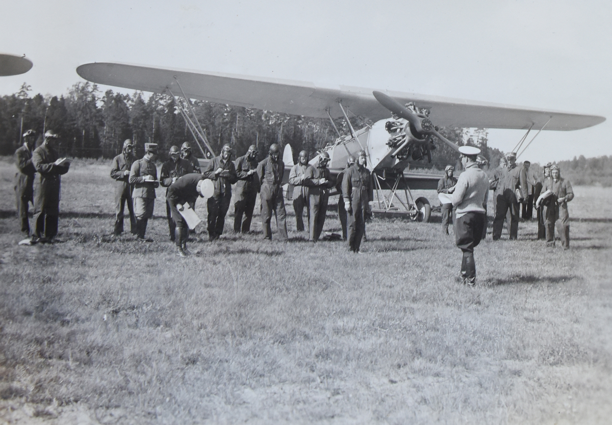 Ordergivning inför flygning vid arméspaningskurs på Malmen, cirka 1934.