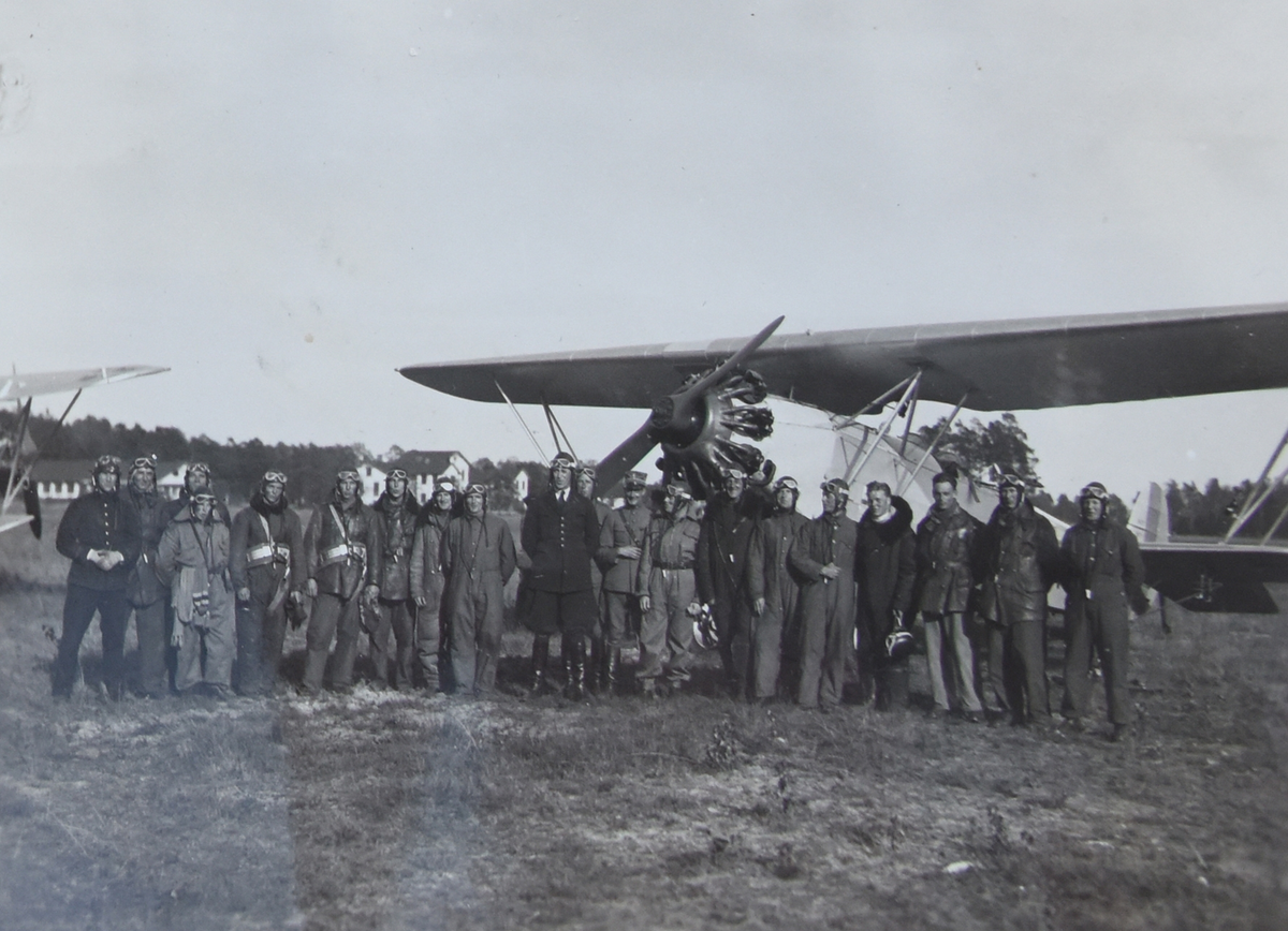 Gruppfotografi av militära flygare framför flygplan S 6 på ett flygfält, omkring 1934-1936.