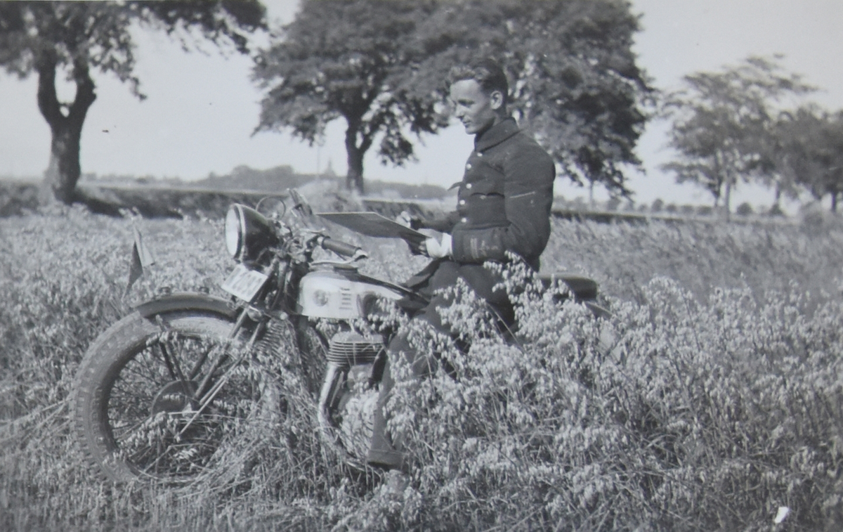 En militär flygare på motorcykel på ett fält, omkring 1934-1937.