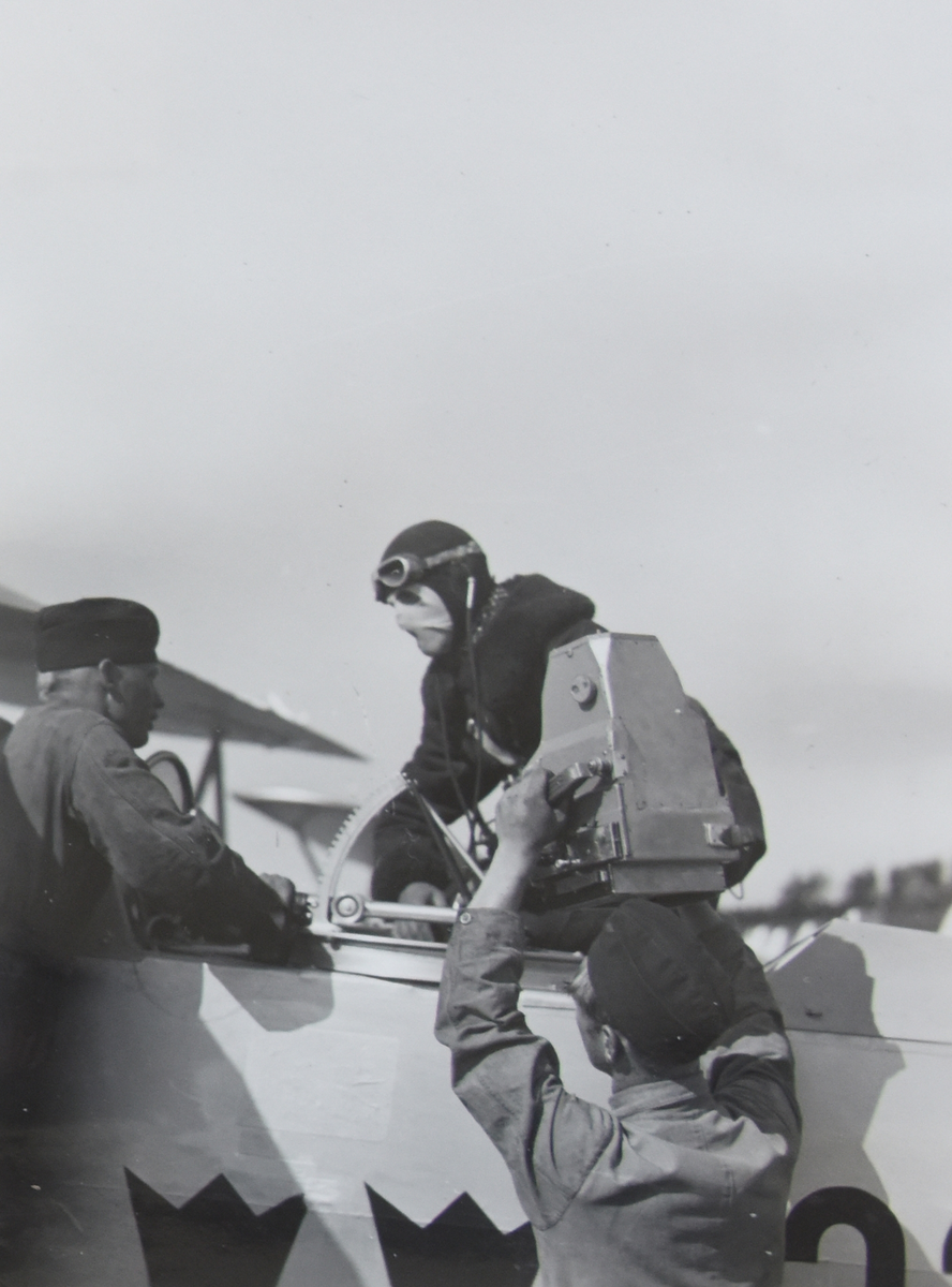 En militär flygspanare kliver i flygplan S 6 Fokker. Flygtekniker assisterar. I förgrunden monteras en handkamera. Omkring 1934.
