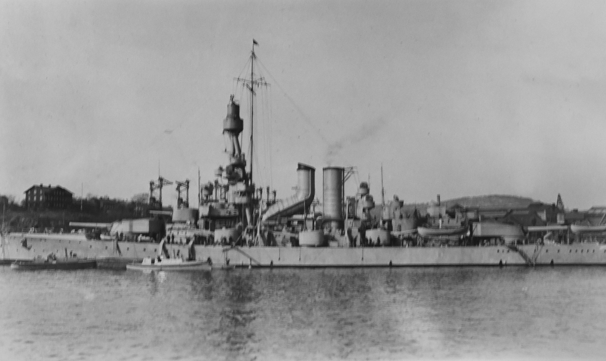 Pansarskeppet HM Sverige ligger ankrad.