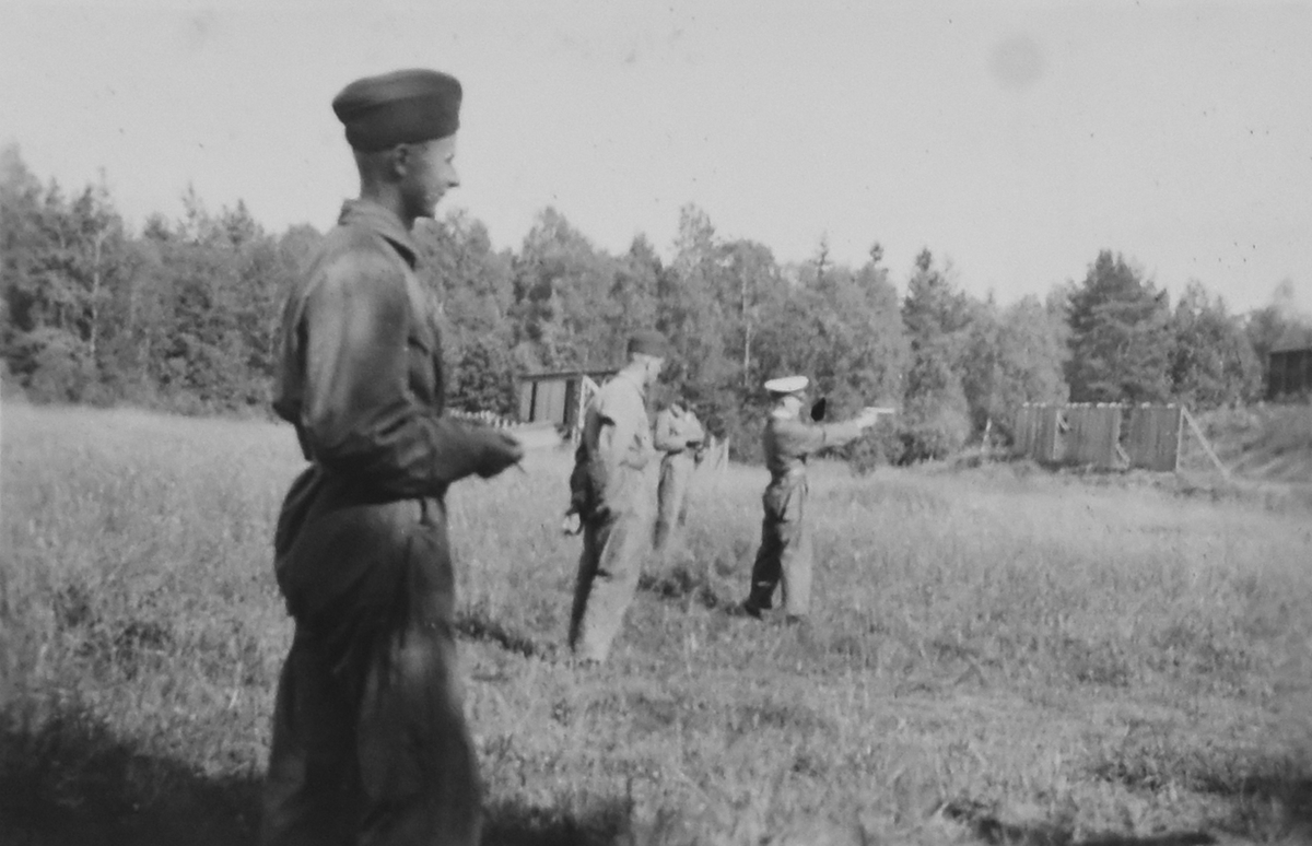 Militärer utöver pistolskjutning omkring 1935-1937. Fyra män på ett fält. Vy från sidan.
