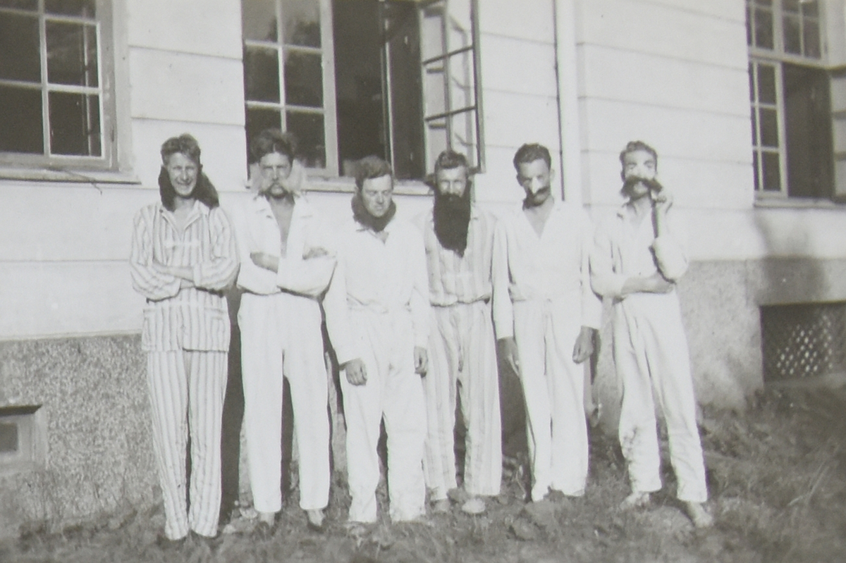 Grupporträtt av sex militära flygare iklädda pyjamas och lösskägg. Deltagare i reservofficersskolan 1935. Femte mannen från vänster är Nils Olof Svensson (senare Sefeldt).