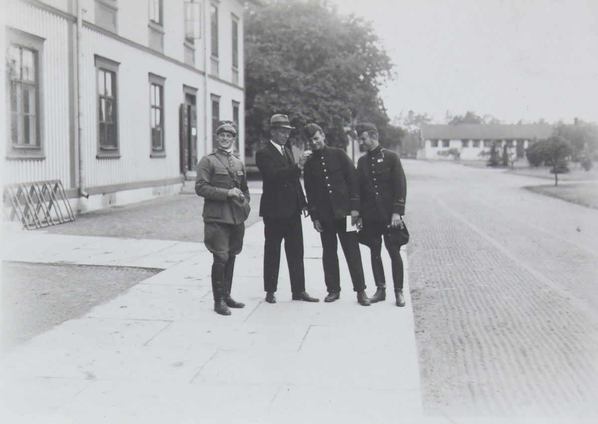 Tre militärer och en civilist i samspråk utanför byggnad, omkring 1935-1936.