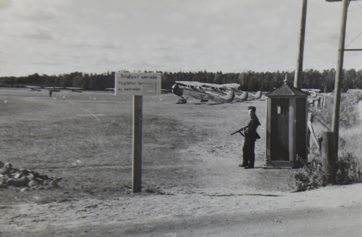 Karlsborgs flygfält med flygplan S 6 Fokker uppställda, omkring 1934-1937. I förgrunden syns vaktkur med en militär vakt med k-pist.