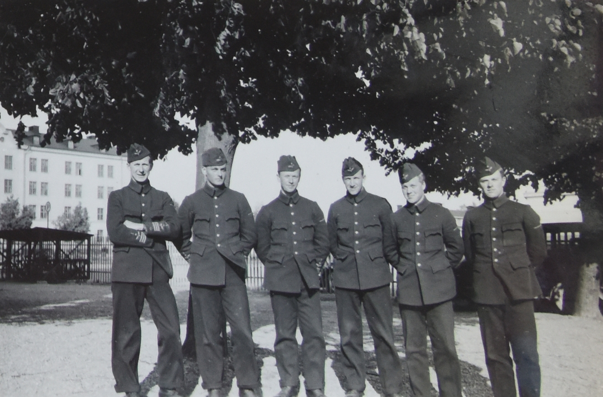 Gruppbild av sex elever vid reservofficersskolan 1935, ståendes vid ett träd. Andra från vänster står Nils Olof Svensson (senare Sefeldt).
