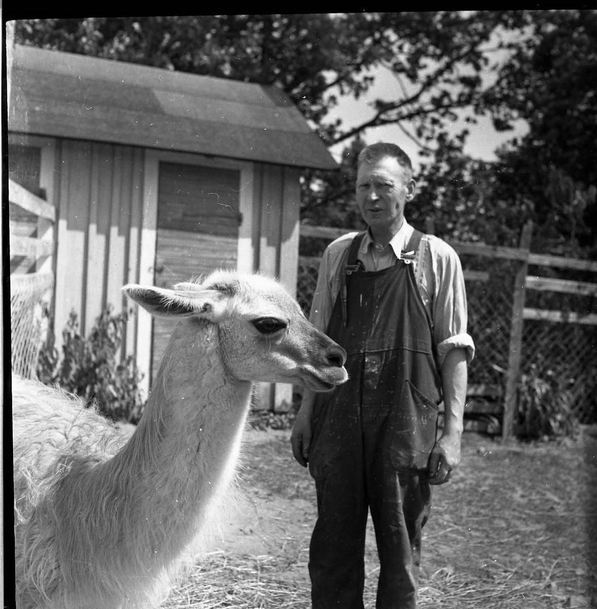 En man i arbetskläder står vid ett ett lamadjur.