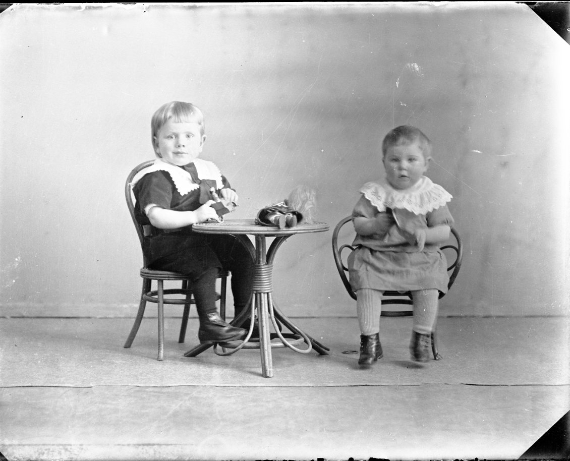 Två små syskon sitter vid en barnmöbel med leksaker, bland annat en docka.