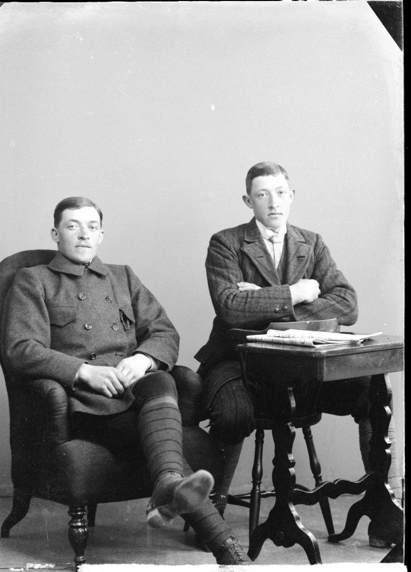 Bröderna Carlsson. Två sittande unga män, Elfin till vänster i en fåtölj och Gunnar på en stol med armarna lutade på ett bord.