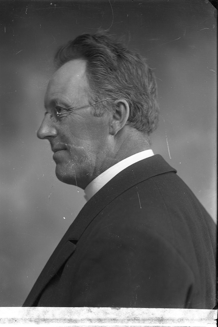 Porträtt av en man i prästdräkt, i profil.