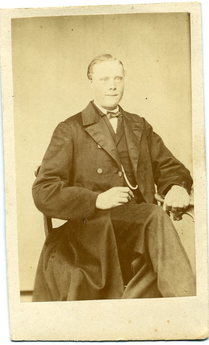 Kabinettsfotografi: porträtt av okänd ung man som sitter på en stol vid runt pelarbord. Hans vänsterarm vilar på bordet.