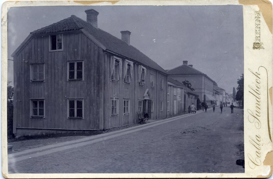 Brahegatan i Gränna med S A Andrée födelsehus närmast till vänster, en tvåvåningsbyggnad med locklistpanel och valmade gavlar. Markiser vid tre av andra våningens fem fönster. En skylt ovanför dörren: "APOTEK" och två stolar till vänster om dörren. En man, suddig, hukar sig vid dörröppningen. Trottoaren utgörs av två rader med borgmästarsten. Gatan är belagd med kullersten. Större och mindre barn står längre bort på gatan och tittar mot fotografen.