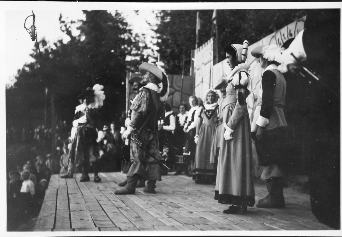 Amatörskådespelare på en scen med scenografi förställande en borg. En stor publik anas till vänster nedanför scenen.