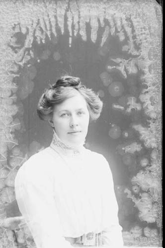 Bröstbild av en ung kvinna med håret uppsatt i knut.