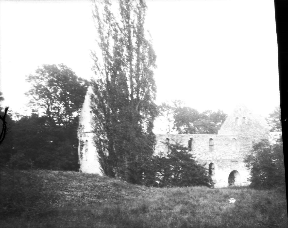 Visingsborgs slottsruin, omgiven av höga träd.