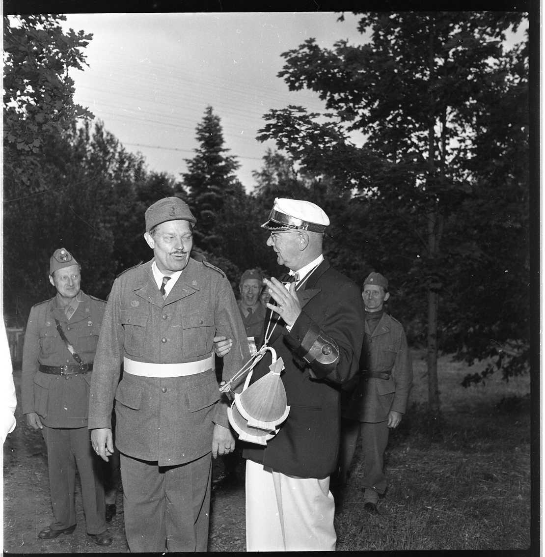 Spex i samband med Osse Gustafssons 60-årsdag. Han står i mörk kavaj, ljusa byxor och vit skärmössa. Han samtalar med en man i uniform och sminkad mustasch - troligen Lauritz Madsen.