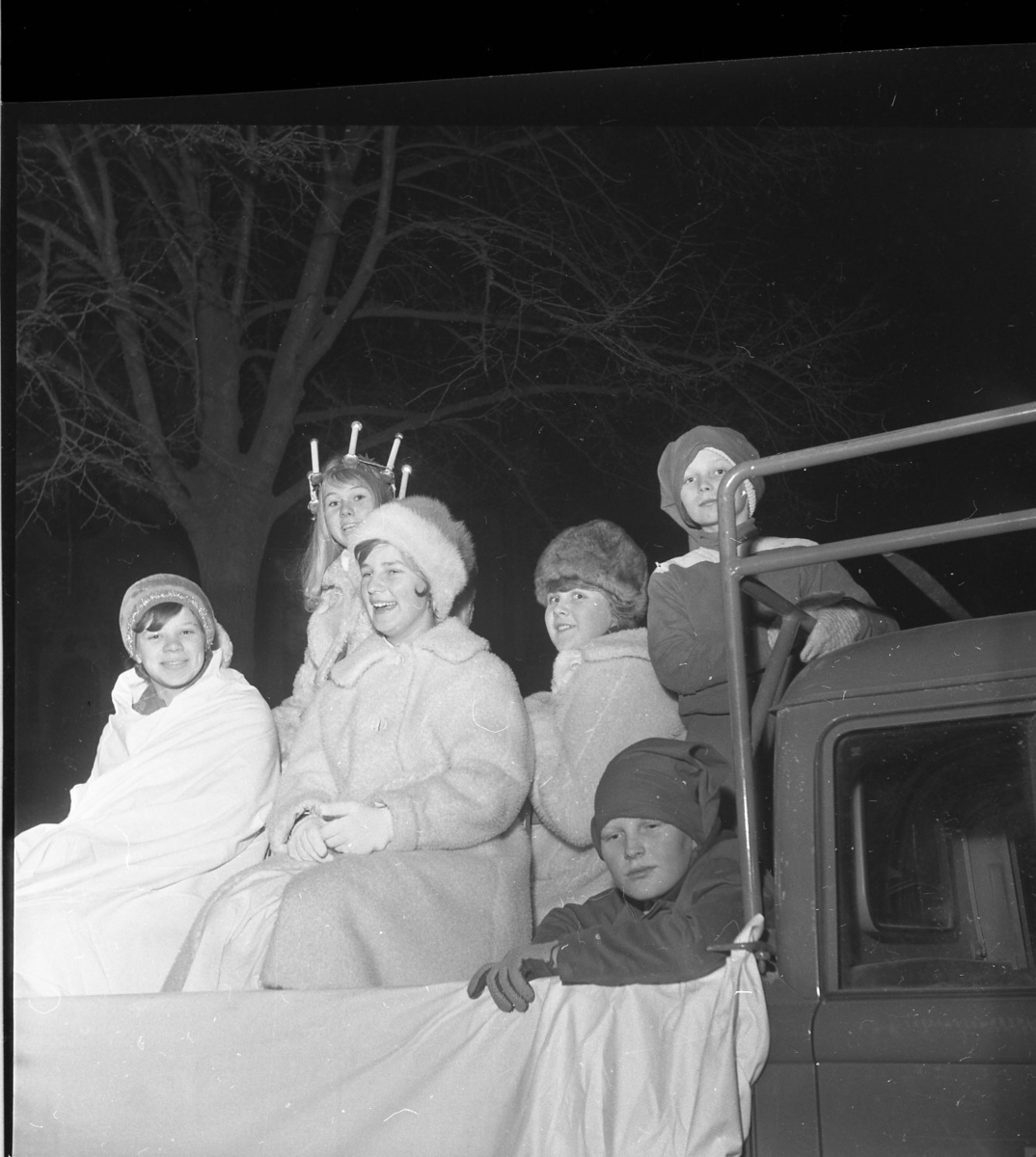 Gränna scoutkårs luciatåg och tomtenissar sitter varmt klädda på en VW-pickup. Lucian heter Marita Wallmo.