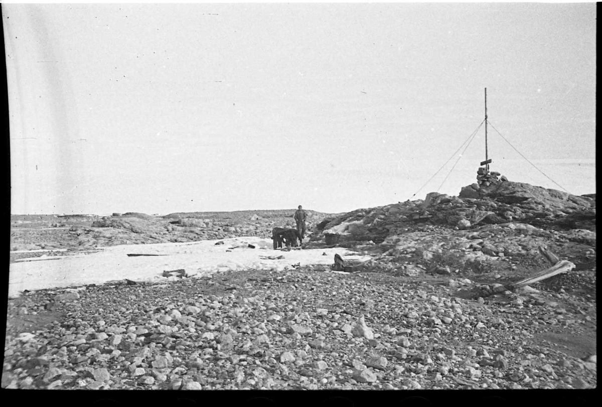 Besättningsmän från Isbjörn i arbete med utgrävning av Andréeläget på Vitön. Till höger Horns varde som markerade platsen för fyndet.