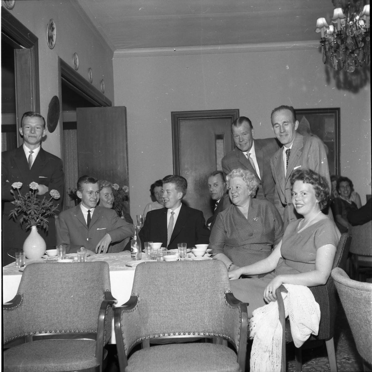 Två män och två kvinnor sitter vid ett bord med en vit duk. Tre män står bakom dem. Alla tittar in i kameran. På bordet står kaffekoppar uppdukade.