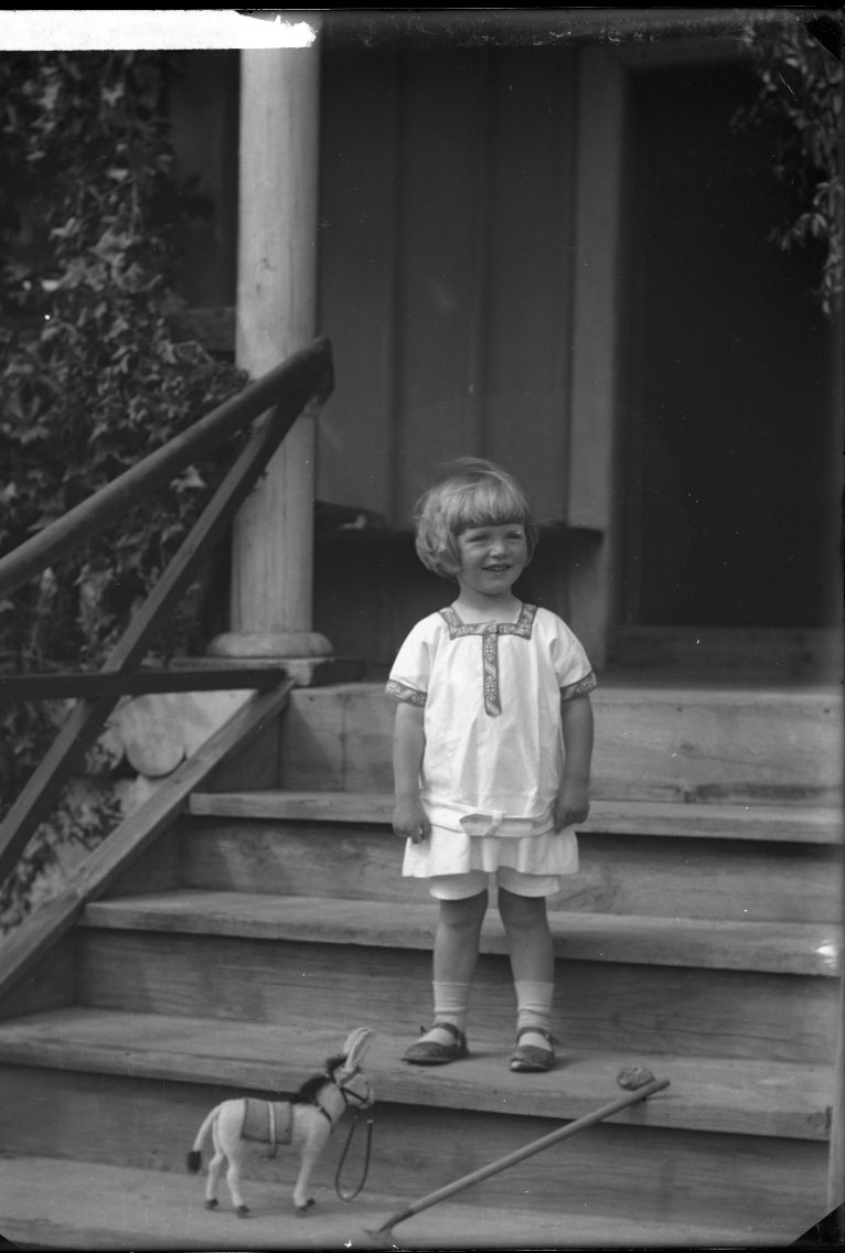 En liten pojke i sommarkläder står på en farstutrapp. Några steg ner står en liten leksakshäst och en liten kratta. Bilden visar "gossen Falkenberg" från Stockholm.