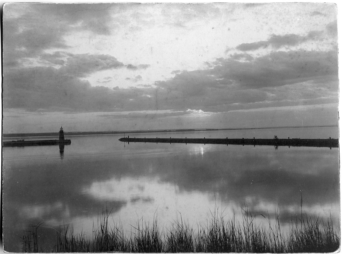 Gränna hamn i kvällsljus, en mulen himmel.