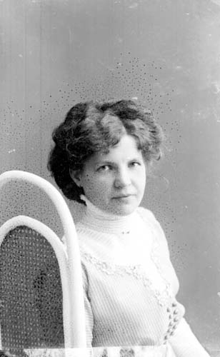 Bröstbild av kvinna som sitter på en stol och vänder sig om mot fotografen.