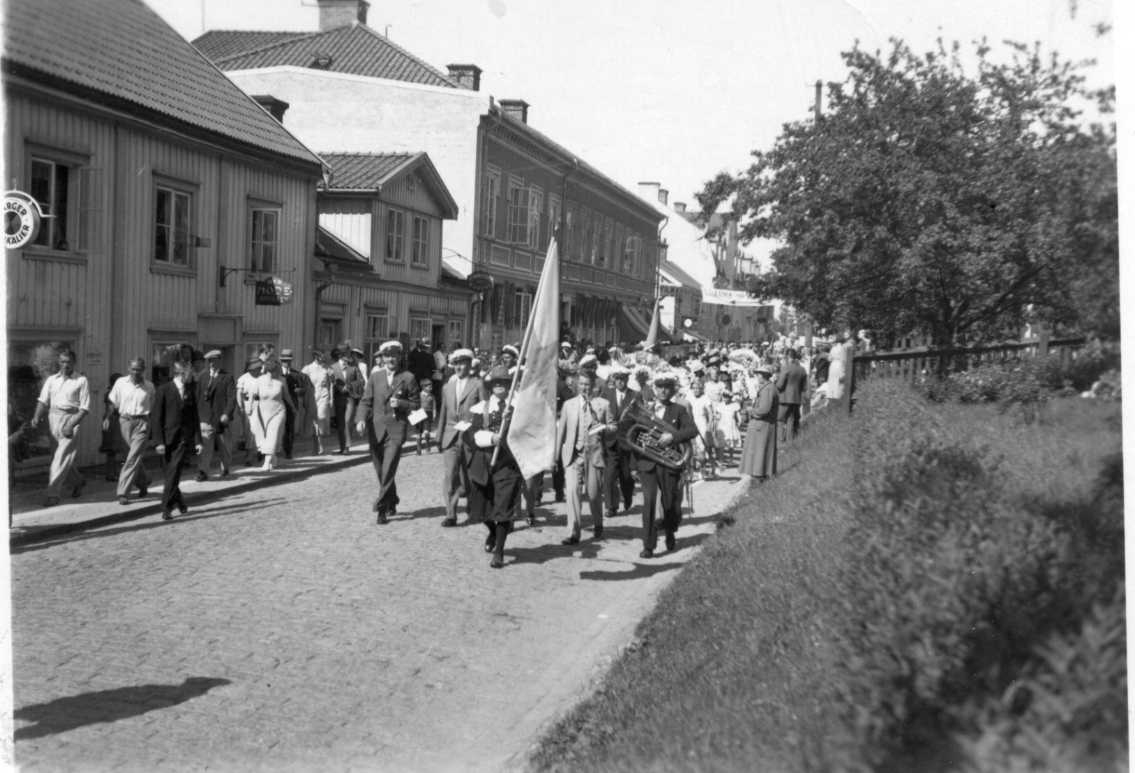 Kortege på Brahegatan i Gränna. Fanbärare Björk i täten framför män i studentmössa och barn och ungdomar i vitt. Fasadskyltar för "Färger Kemikalier" respektive "Nya Modeaffären"