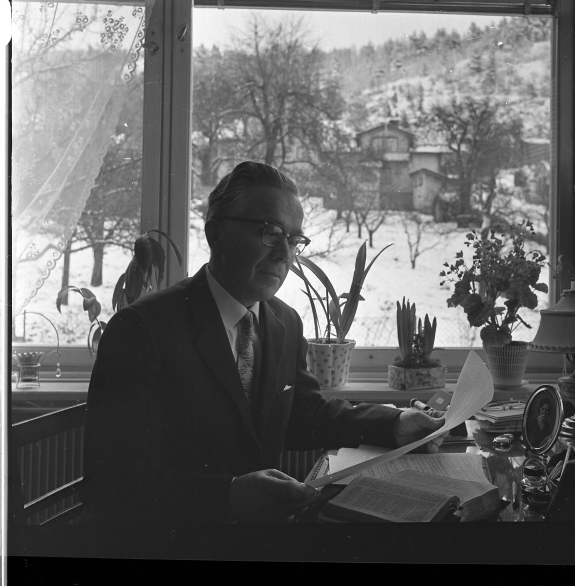 Ett porträtt av Robert Svensson, pastor i Filadelfiakyrkan. Han sitter vid ett skrivbord med utsikt över trädgården.