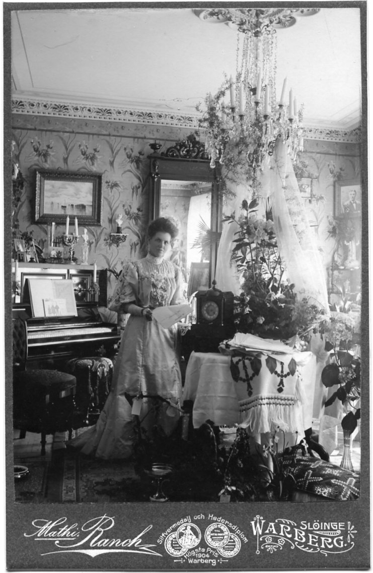 Kabinettsfotografi: Fotografen Mathilda Ranch vid ett bord i sitt hem bland blommor och telegram. Ett piano vid väggen bakom henne.