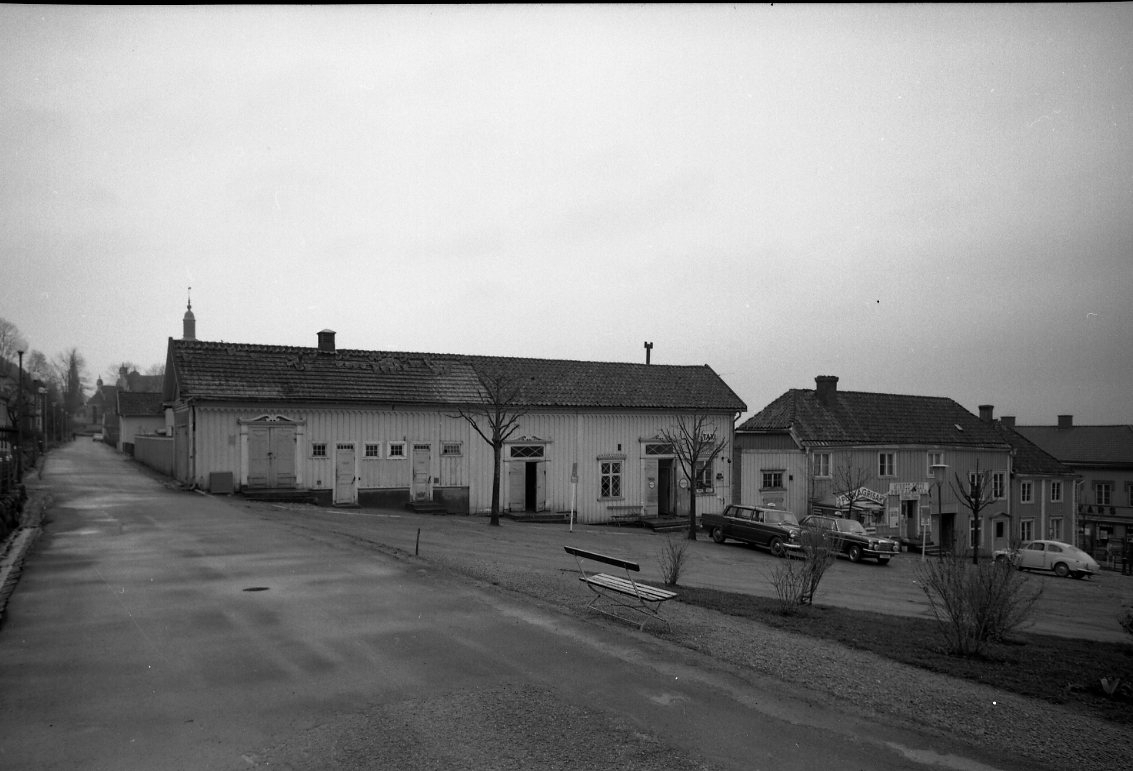 Bergsgatan söderut från torget, det har regnat. Bebyggelsen utmed torgets södra sida med bland annat Taxi - bilar av märket Mercedes Benz står parkerade utanför - och en randig kiosk som säljer Polkagrisar