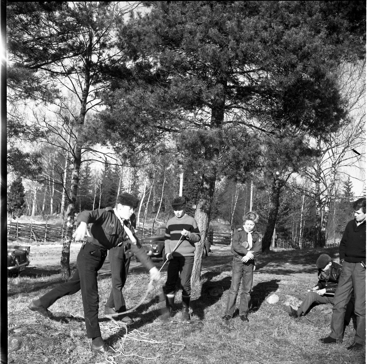 Ett gäng unga scouter står tillsammans under en tall. En kille slungar iväg någonting med hjälp av ett rep. Två utav killarna har pälsmössa på huvudet.